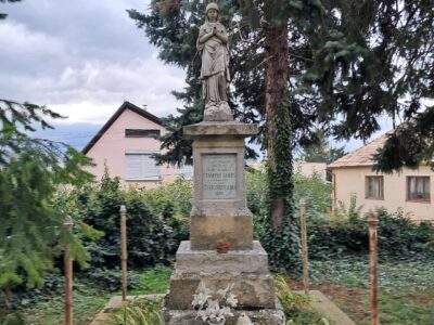A Szűzanya kőből faragott szobrát 2010-ben helyezték a templom elé az öntvény oszlopra.
